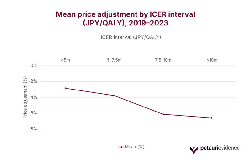 This gradient reflects the structured four‑band adjustment framework embedded within Japan’s CEA system and illustrates that the higher the ICER, the stronger the downward price pressure.