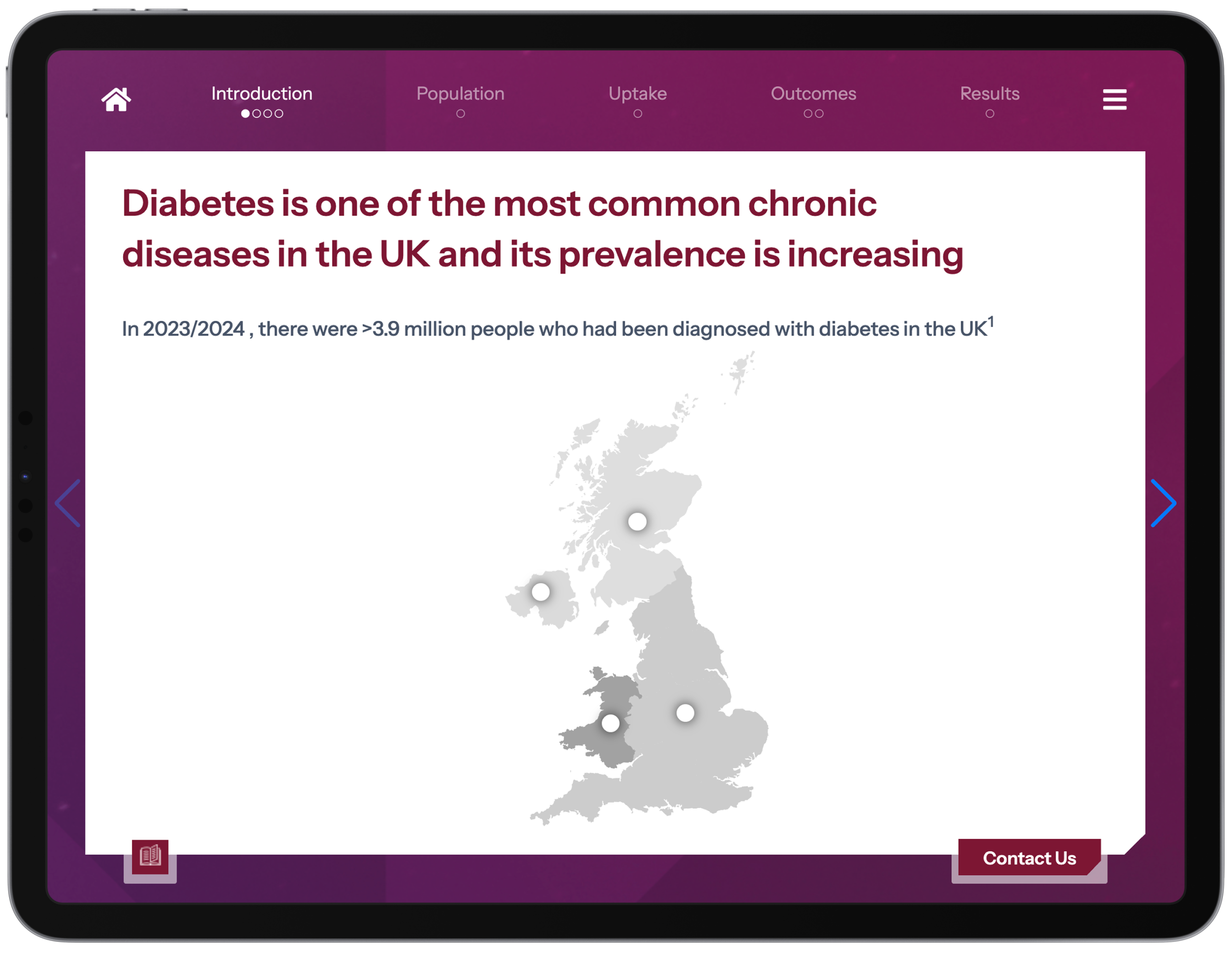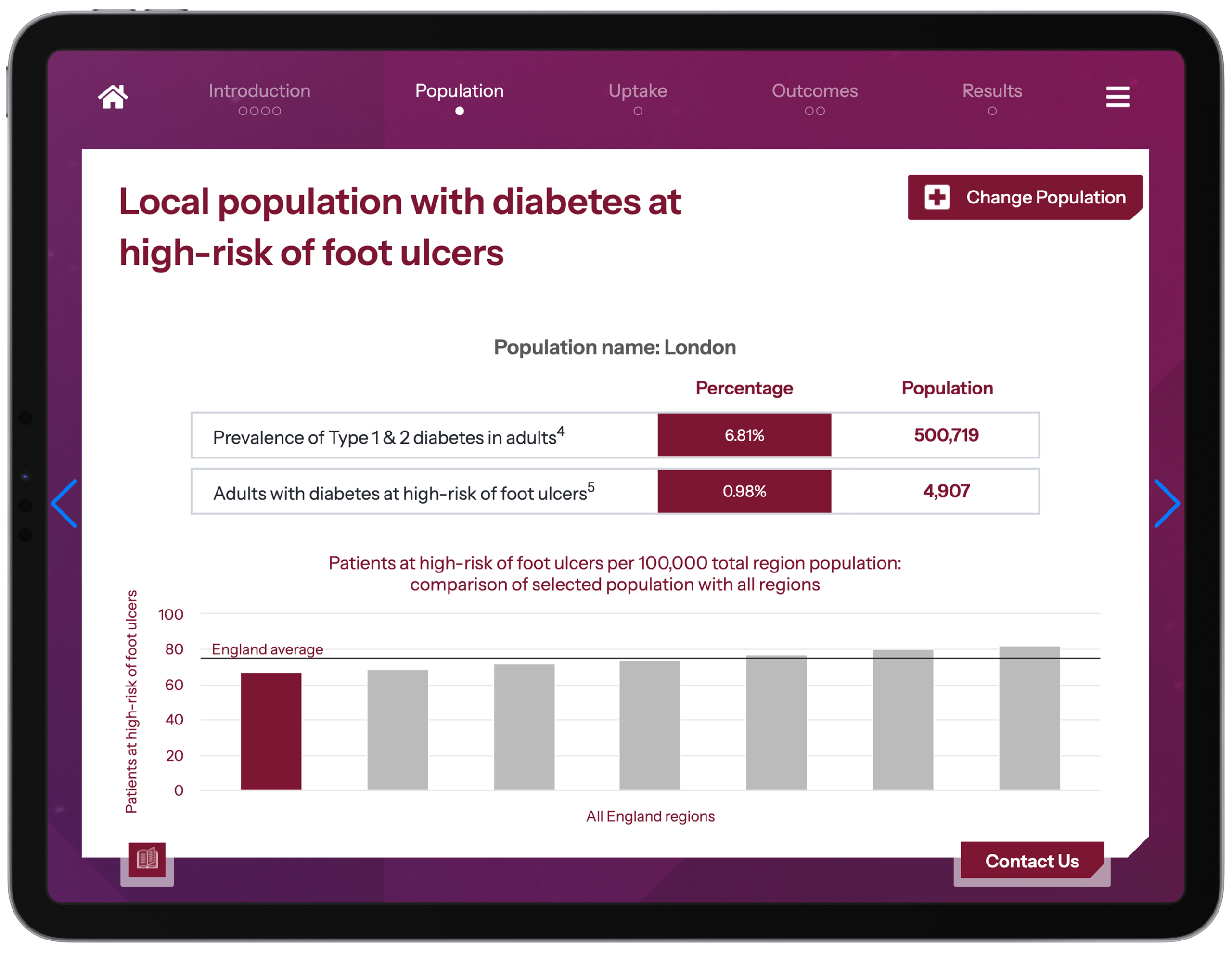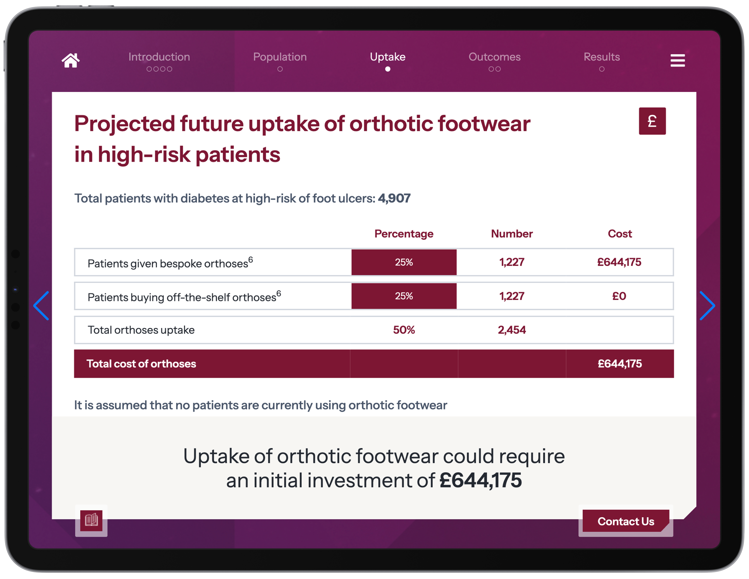This demo uses placeholder data, structured for the UK market, to illustrate the value of orthotic footwear for people with diabetes at high risk of foot ulcers and amputations. It shows how tools like this can be used to simulate cost savings and clinical outcomes. The approach is adaptable to any pharmaceutical or medical device product.