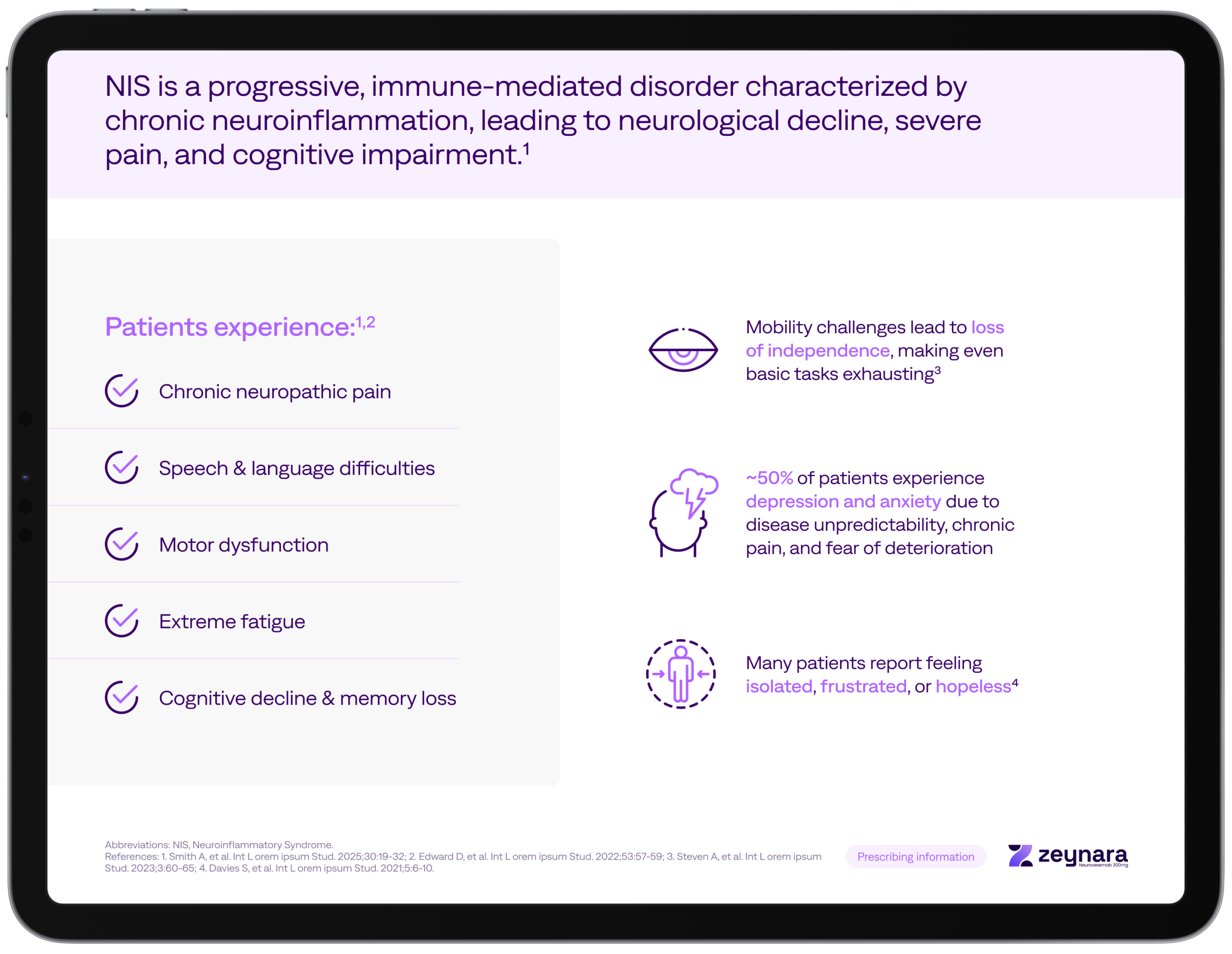 This demo uses placeholder data and a fictional product, Zeynara, to illustrate how the tool works. The example includes simulated treatment and comparator therapies to demonstrate how users can build presentations around clinical claims, value stories, and launch sequences.
