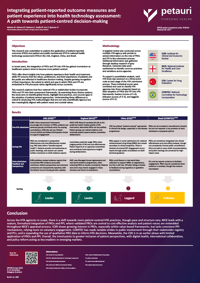 The Petauri Evidence team will be presenting this research at ISPOR Europe in Glasgow, in Poster Session 5 on Wednesday 12th November.